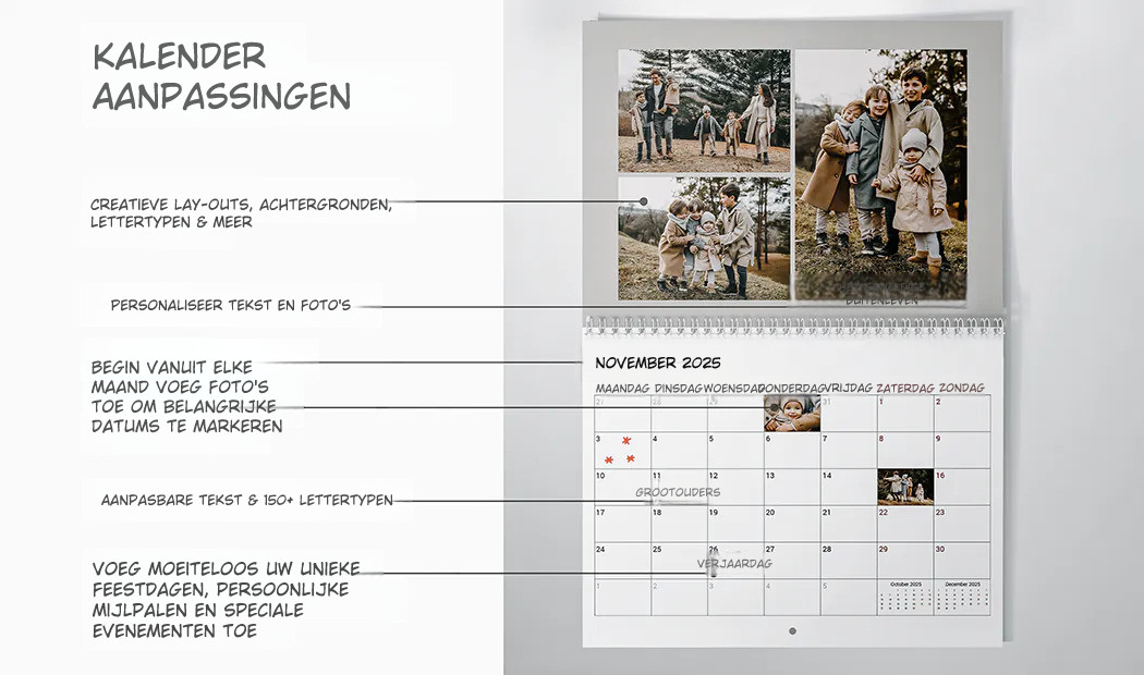 Ja, je kunt je kalender vanaf elke maand starten. Deze flexibiliteit stelt je in staat om op elk moment van het jaar een kalender te maken en te genieten van een volledige looptijd van 12 maanden vanaf de door jou gekozen startdatum.
