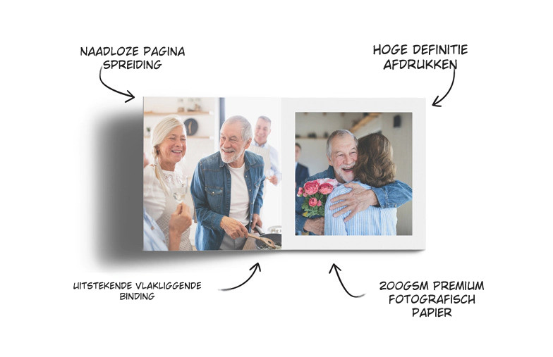 Onze layflat binding opent volledig plat, zodat je panoramische foto’s zonder vouwlijnen kunt tonen.