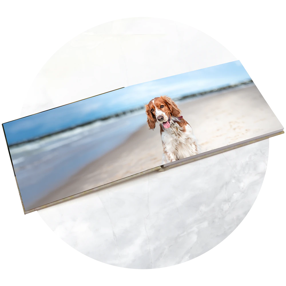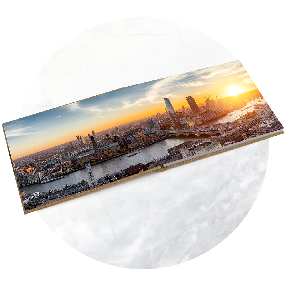 Onze layflat binding opent volledig plat, zodat je panoramische foto’s zonder vouwlijnen kunt tonen.