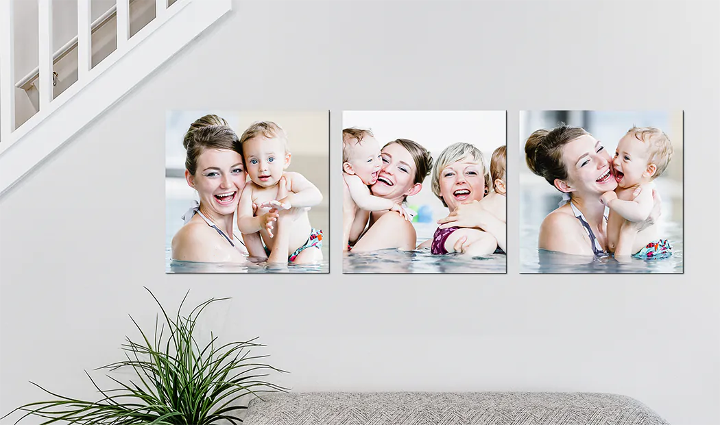 Geen gedoe meer met haken of ophangen. Onze lichte, gepersonaliseerde fototegels zijn perfect om te plakken, te wisselen en op afstand te houden, zodat je een unieke presentatie voor mama kunt maken die perfect in haar ruimte past.