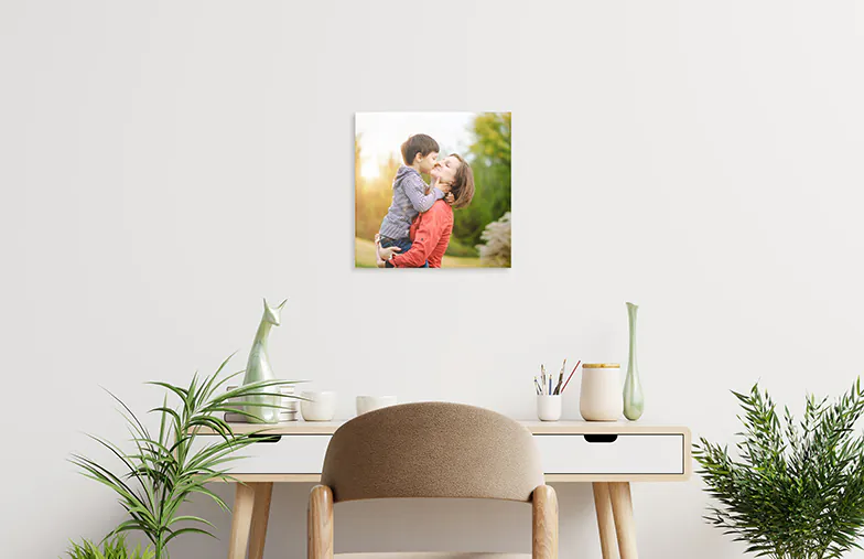 Geen gedoe meer met haken of ophangen. Onze lichte, gepersonaliseerde fototegels zijn perfect om te plakken, te wisselen en op afstand te houden, zodat je een unieke presentatie voor mama kunt maken die perfect in haar ruimte past.