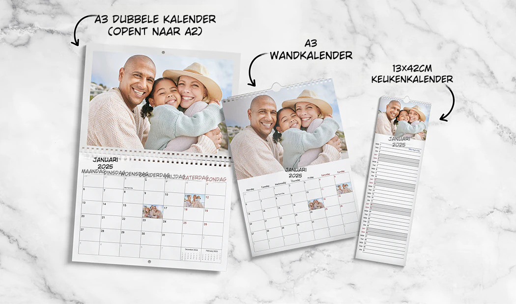 Onze gepersonaliseerde kalenders zijn verkrijgbaar in verschillende formaten die passen bij uiteenlopende behoeften en ruimtes: