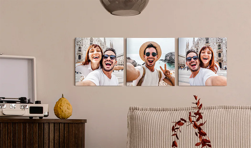 Maak in enkele seconden een canvas van archiefkwaliteit met 3 foto's. Klaar om op te hangen opties beschikbaar.